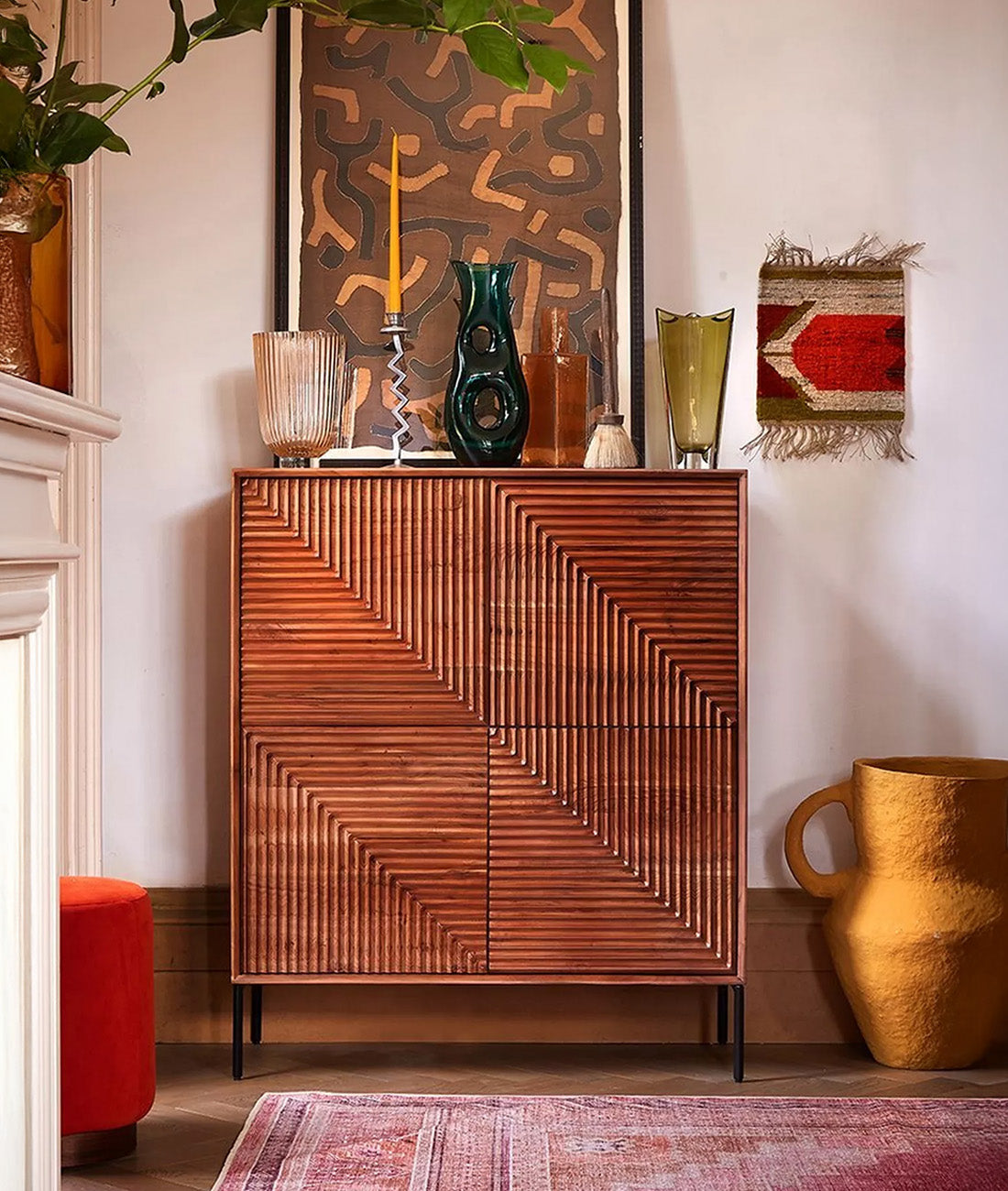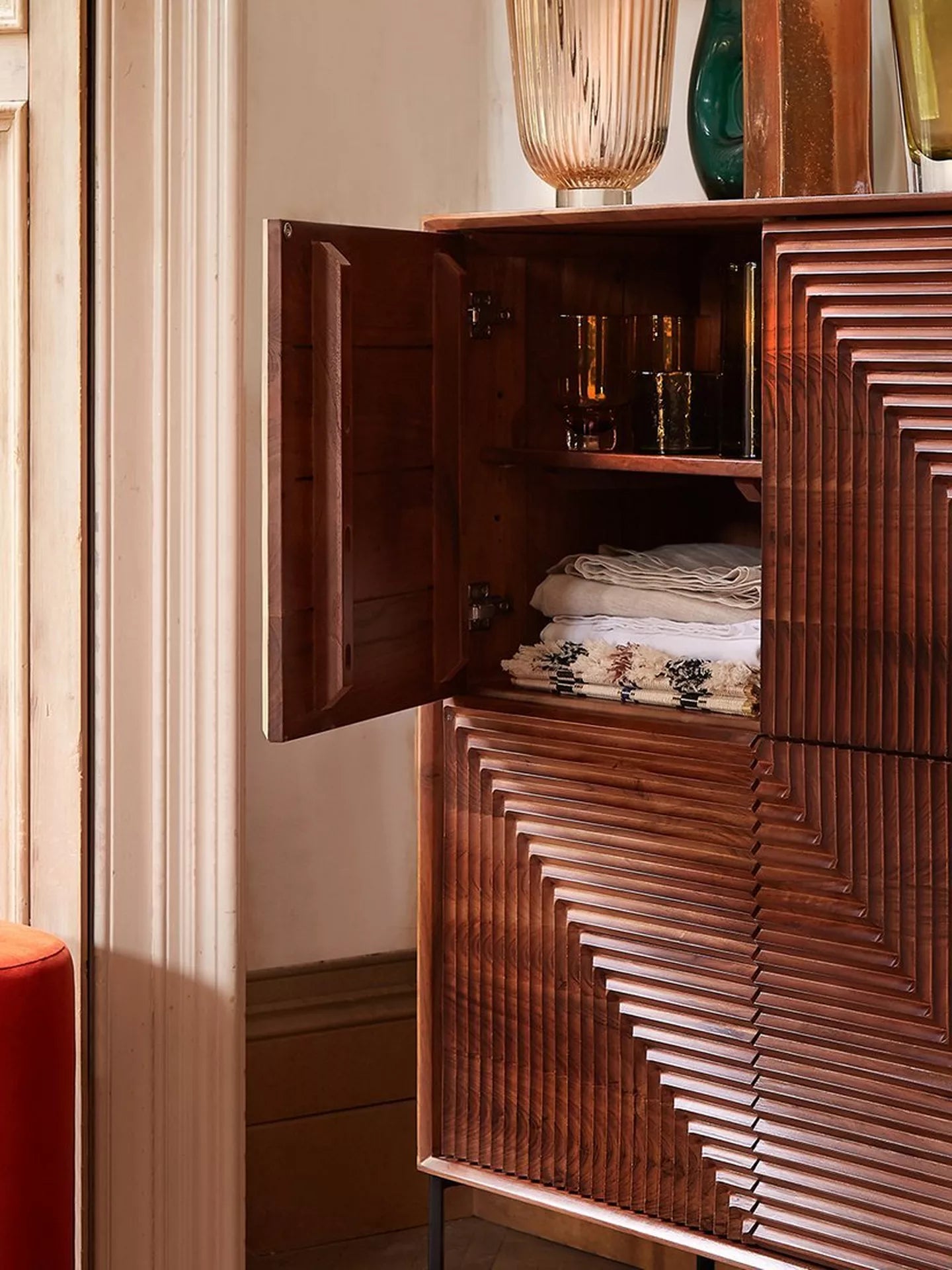 The Kodi Cabinet commands attention with its striking concentric ridge detailing and charcoal-coated legs, finished in rich dark acacia that complements any interior. Three generously proportioned shelves and an internal divider deliver exceptional storage flexibility, allowing you to organize everything from décor to everyday essentials with ease. This isn't just functional furniture—it's a statement piece that elevates your space while keeping clutter beautifully contained.