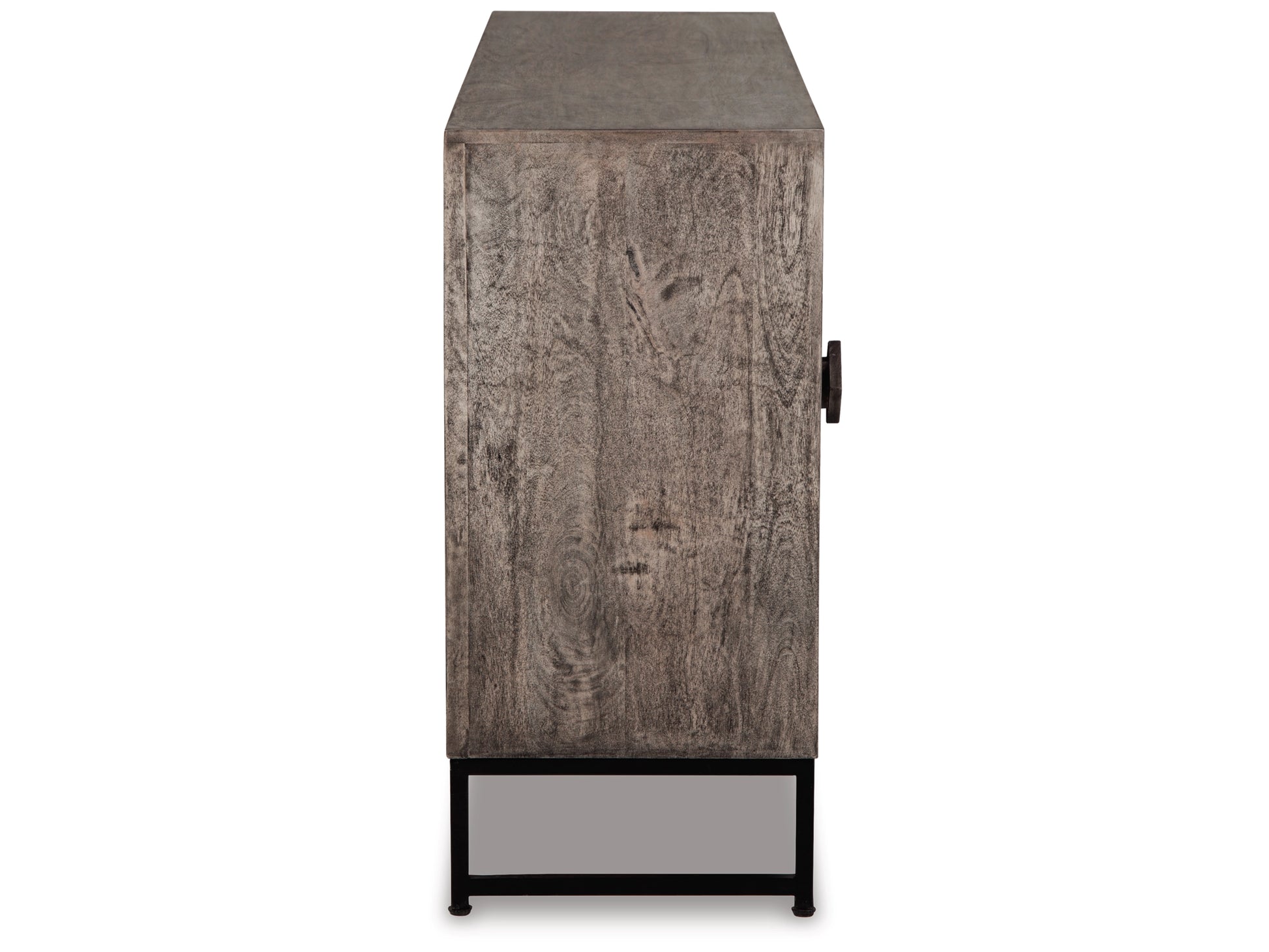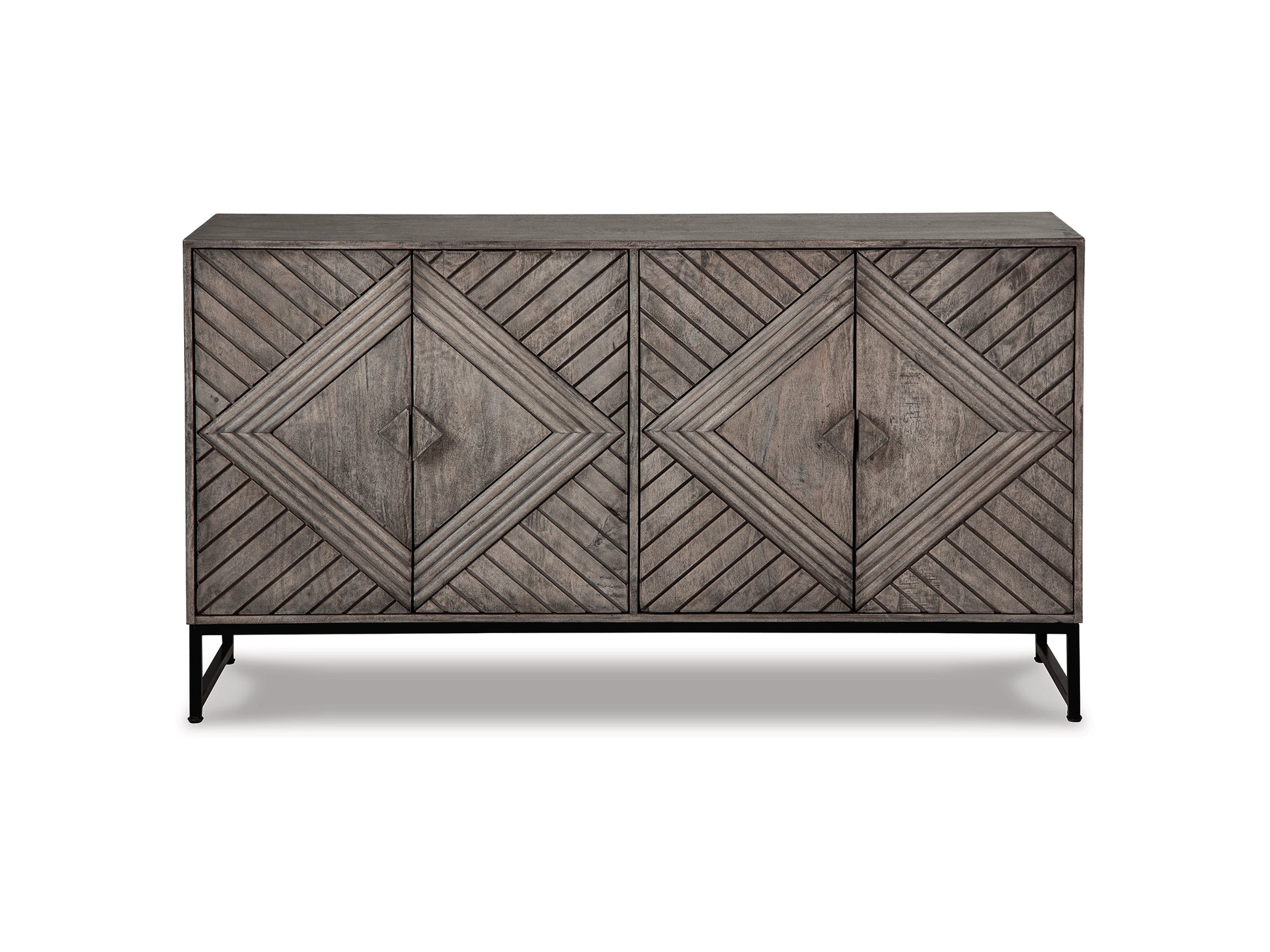 The Maddy Sideboard brings rustic elegance to any room with its striking distressed gray wood finish and sturdy black metal base. Four spacious doors feature an eye-catching diamond pattern, opening smoothly with soft-close hinges for a refined touch. Inside, two adjustable shelves provide flexible storage for your essentials, keeping everything organized and within reach. Perfect for dining rooms, living spaces, or entryways, this statement piece combines timeless design with practical functionality. Transform your home with a sideboard that's as beautiful as it is useful.