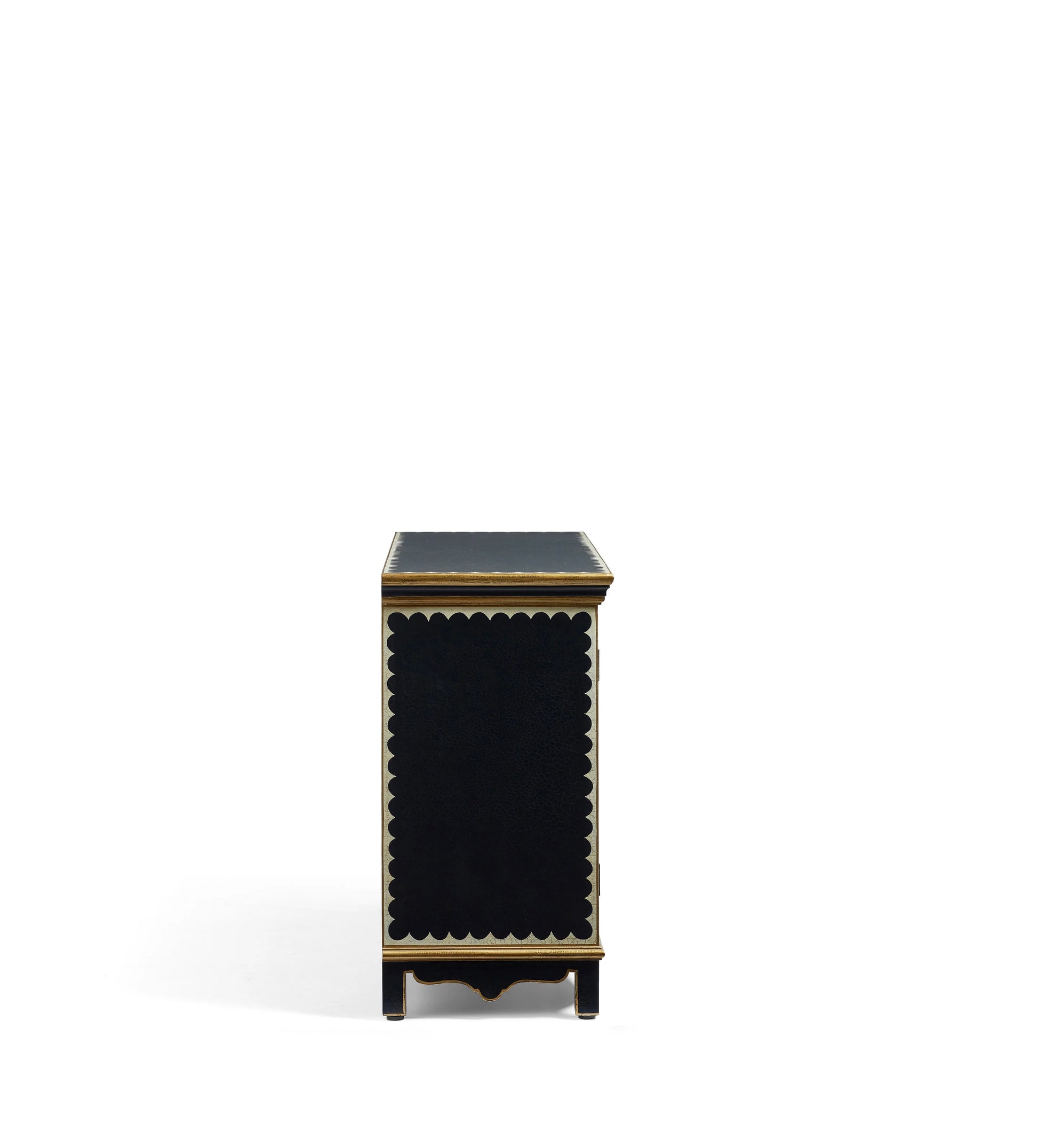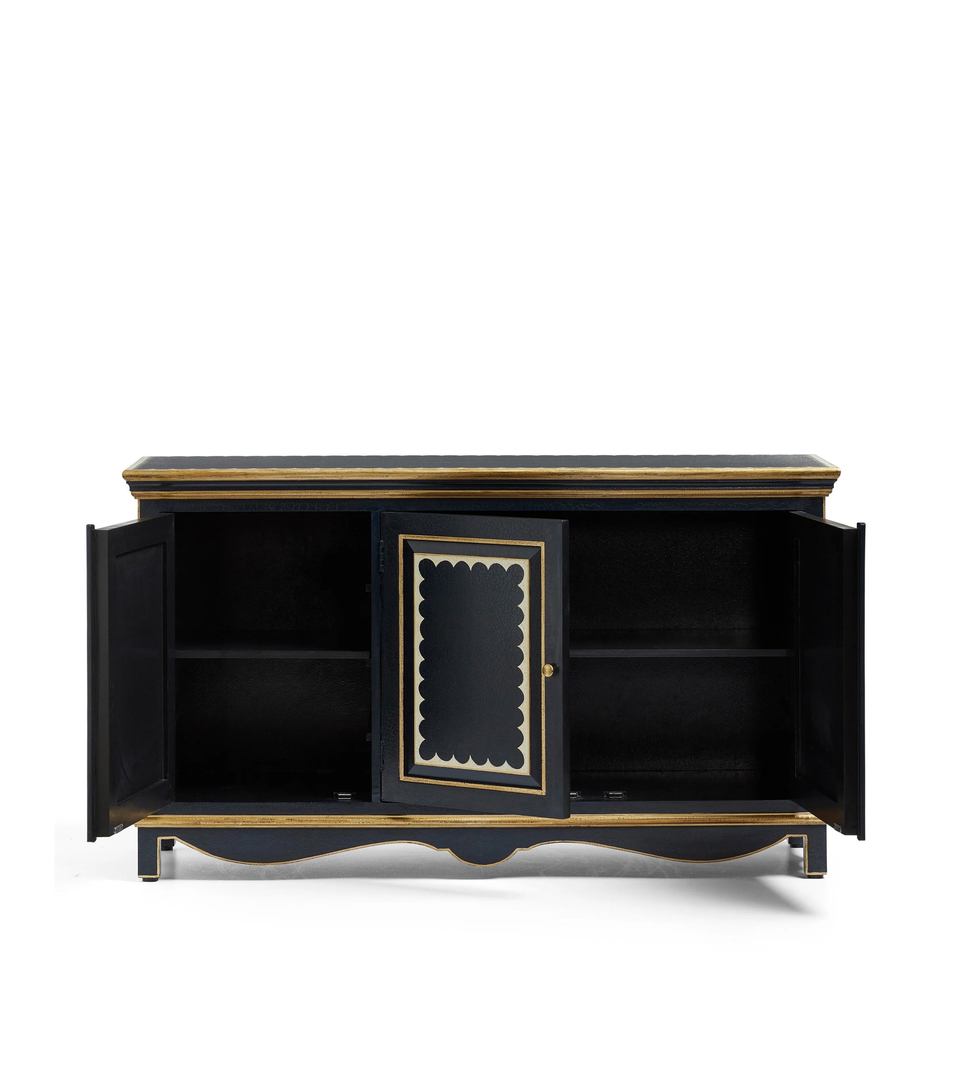 The Napoli Sideboard marries artisanal craftsmanship with sophisticated design. Hand-painted in midnight blue with striking white wave detailing, crackled accents, and warm gold touches, this piece exudes timeless elegance. Three spacious doors conceal generous shelving for curated storage or display, while the expansive top surface welcomes decorative objects, table lamps, or serves as an elegant entertaining platform. A statement-making addition that transforms any dining or living space into a gallery of refined taste.
