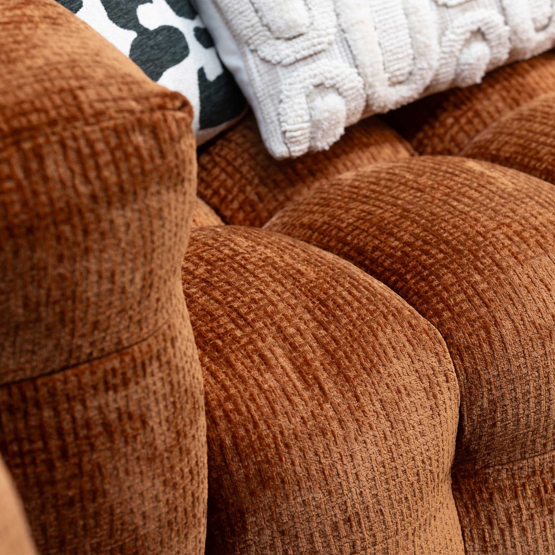 The Vesper Orange Textured Sofa transforms your living space into a sanctuary of refined comfort. Crafted with sumptuous chenille fabric and distinguished by elegant tufting and a bold, contemporary silhouette, this sofa seamlessly blends modern aesthetics with timeless appeal. The thoughtfully engineered cushions—combining 40% foam with 60% loose fibre—deliver the perfect balance of plush softness and supportive structure. Rustic wooden feet ground the design with natural warmth, while the generous proportions invite you to sink in and unwind. More than furniture, it's an invitation to embrace everyday luxury and create moments of pure relaxation in a space that truly feels like home.